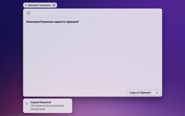 Generates a password from 5–64 characters with options for case, special characters, and more